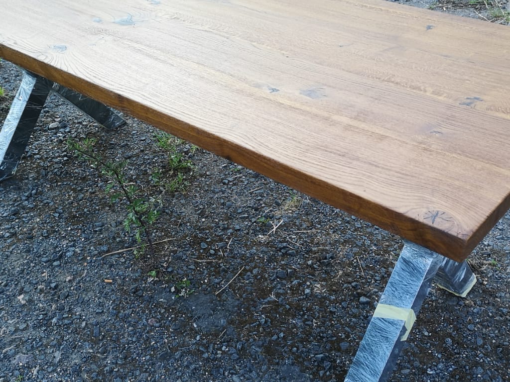 Ukázka výroby dubového jídelního stolu s kovovou podnoží. Vyrobíme vám dubové stoly z masivního dobu, nebo jen dubovou masivní stolovou deskou s ocelovou podnoží. Vyrábíme dubové stolové desky pro stoly do kuchyně, jídelen, barů, restaurací, na pracovní stoly atd.