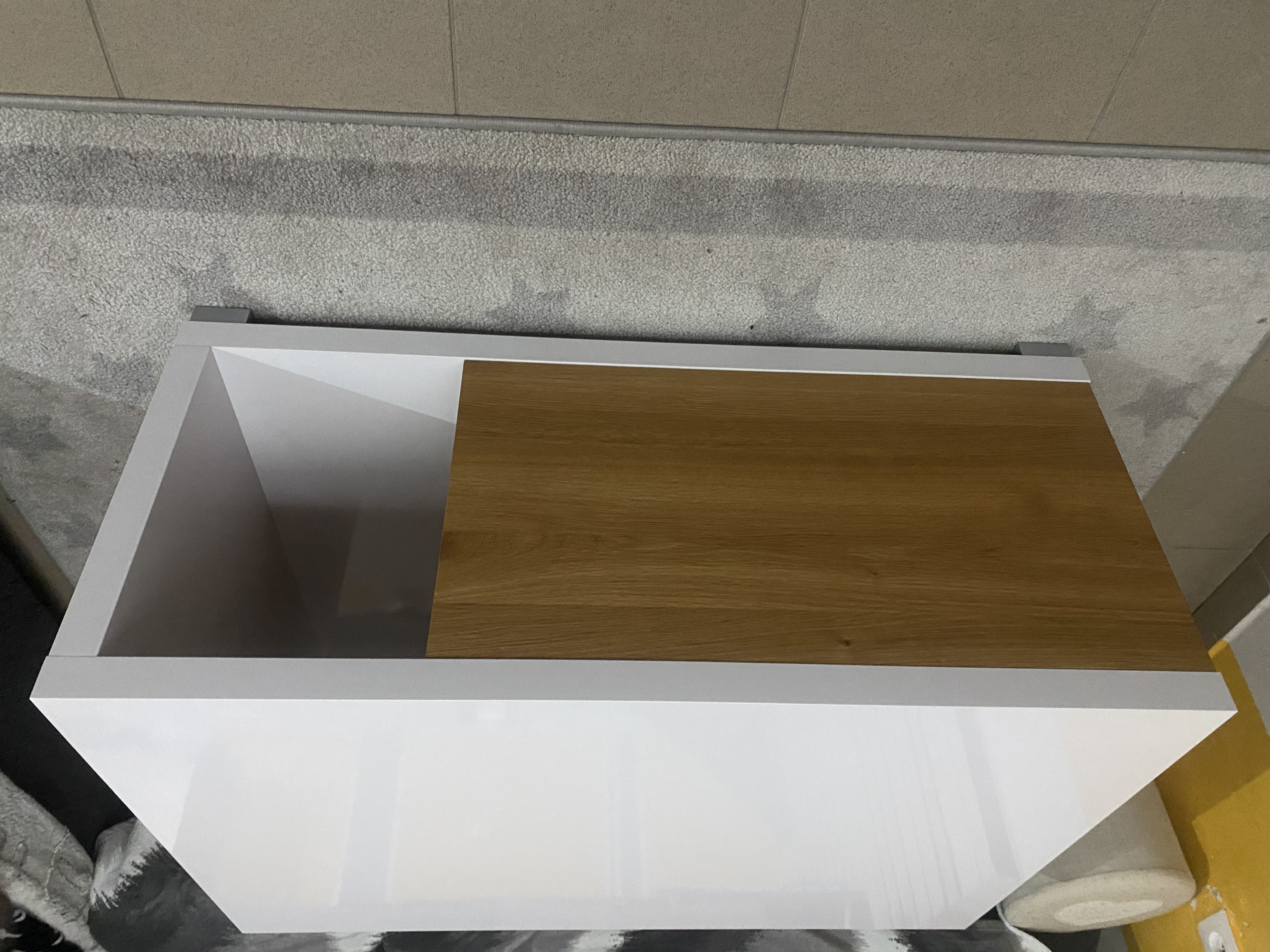 Konferenční stolek dub v kombinaci lamino bílá vysoký lesk. Kombinace masivní dřevo dub s lamino deskou vysoký lesk, výroba nábytku a nábytkových dílců. Výroba nábytku dle projektu. Masivní konferenční stůl dub v kombinaci lamino deskou vysoký lesk.