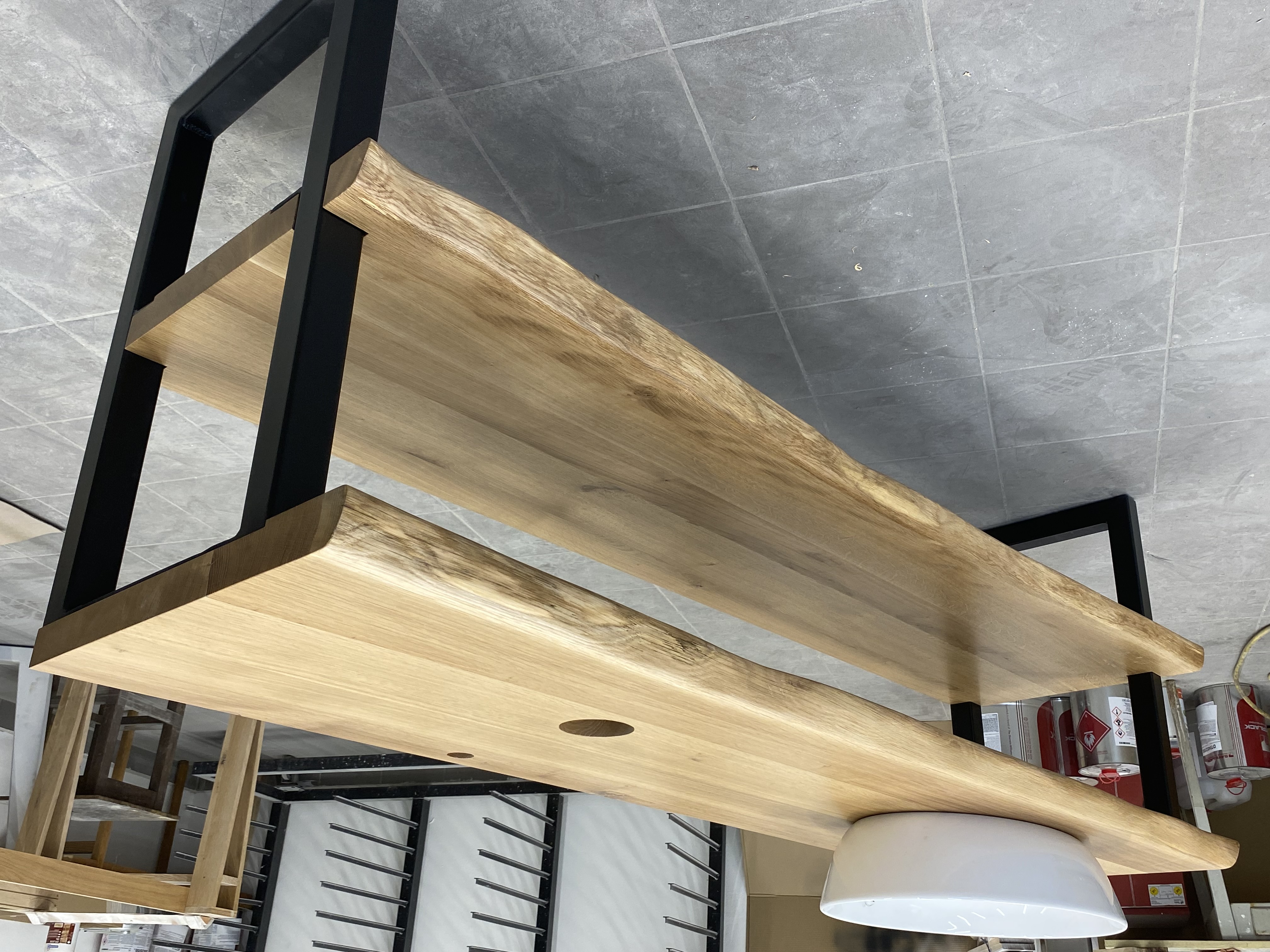 Koupelnová skříňka pod umyvadlo dub. Koupelnová dubová skříňka pod umyvadlo ocelová - kovová konstrukce, masivní dubová deska do koupelny, přírodní hrany, rostlé hrany, živá hrana. Atypická masivní dřevěná koupelnová deska - železná konstrukce - podnož, koupelnový nabytek z masivu na zakázku.